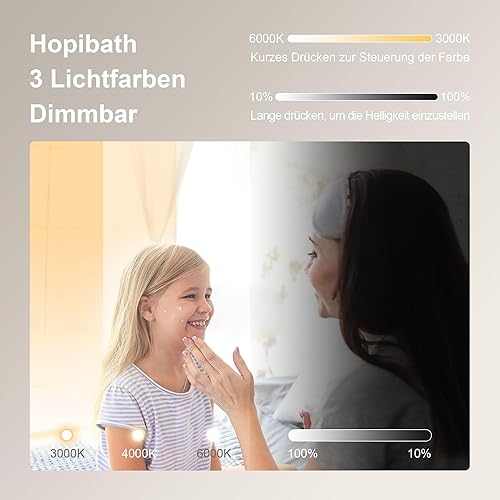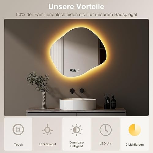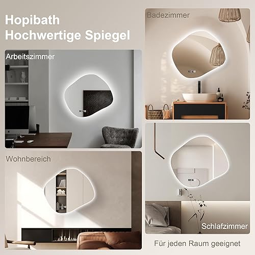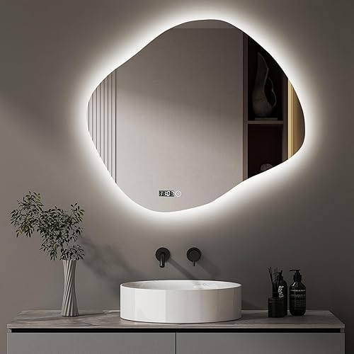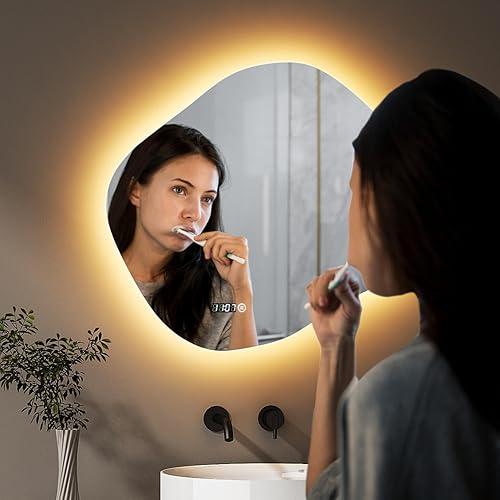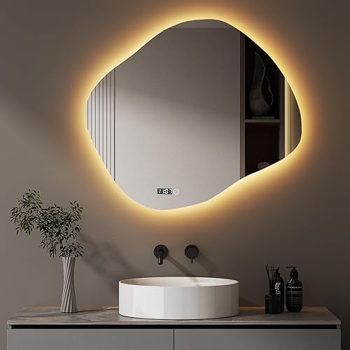 Hopibath Miroir de salle de bain LED avec horloge, asymétrique, interrupteur tactile, intensité variable, 3 couleurs de lumière, miroir mural organique, 74 x 84 cm
