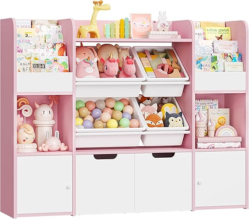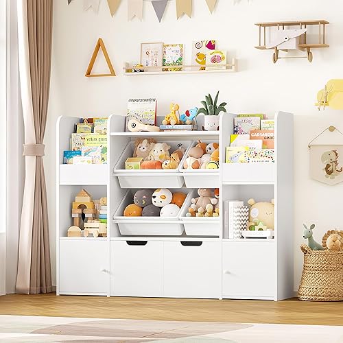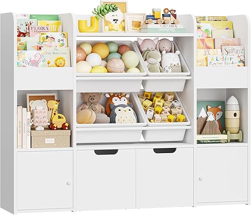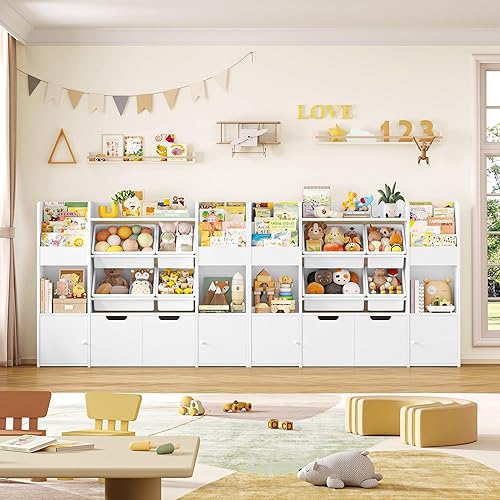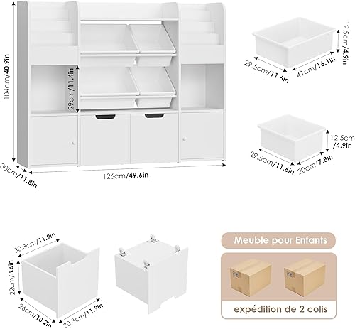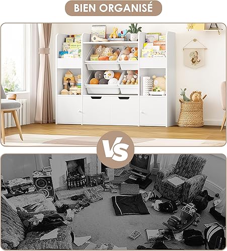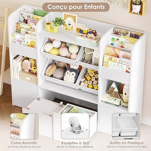 FOREHILL Meuble Rangement Enfant Bibliothèque Enfant avec 13 Étagères 4 Boîtes Amovibles 2 Tiroirs Roulants Rangement Jouet pour Chambre d’Enfants Salle de Jeu Blanc