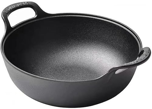 Wok en fonte, poêle à frire antiadhésive avec couvercle en bois, double poignée à fond plat pour cuisinières électriques à gaz à induction (B)