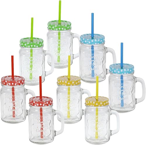 Spetebo Lot de 8 verres à boire avec couvercle et paille - Verres vintage avec anse - Verres à couvercle avec couvercle à visser pour eau, limonade, cocktails