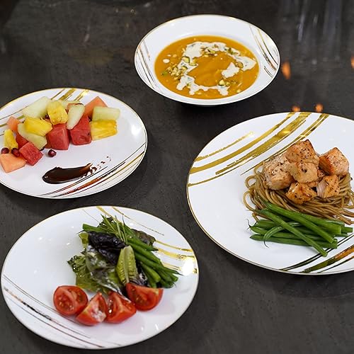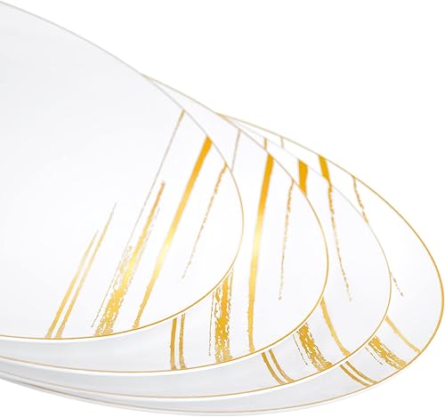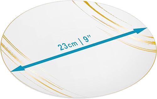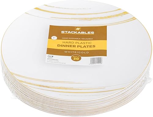 STACKABLES ~ Lot de 20 assiettes en plastique rigide ~ 22,9 cm Assiettes blanches avec motif doré ~ Ensemble de vaisselle de fête léger flexible réutilisable