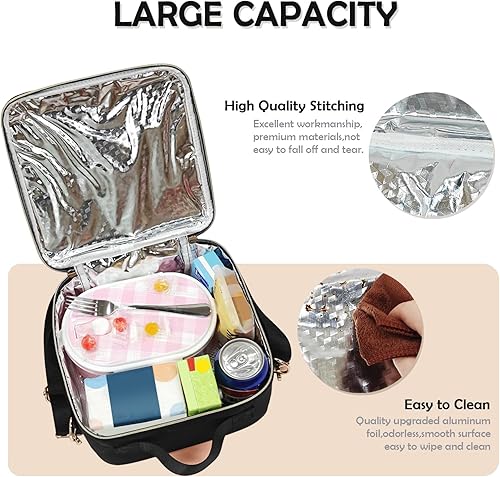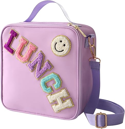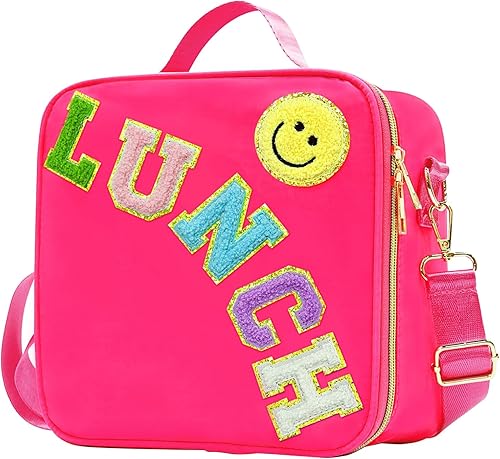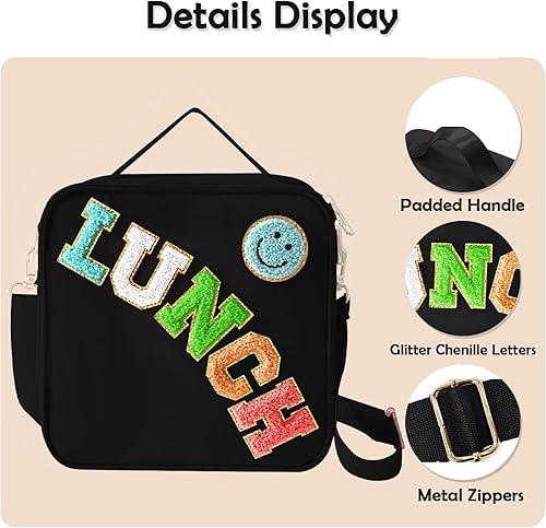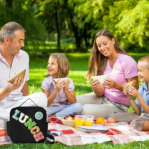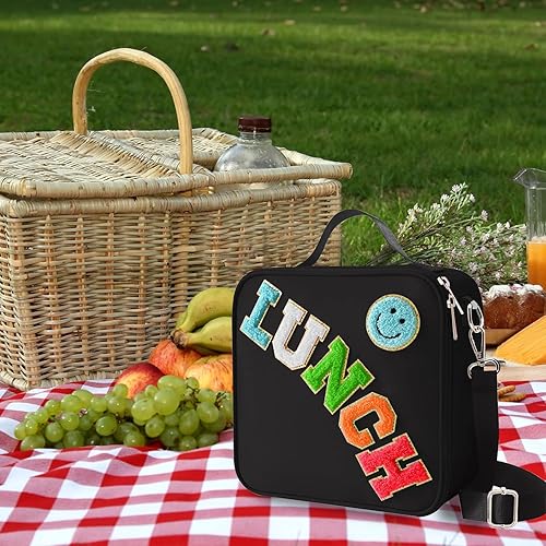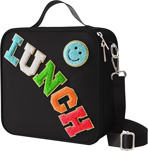 MEEYUU Sac à déjeuner isotherme en nylon pour garçons et filles - Grand sac à déjeuner isotherme réutilisable avec smiley Preppy pour filles, école, voyage, pique-nique - Réglable (noir)