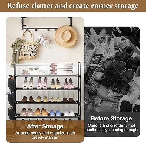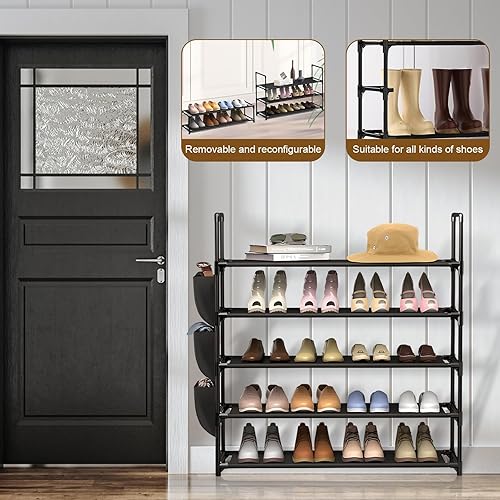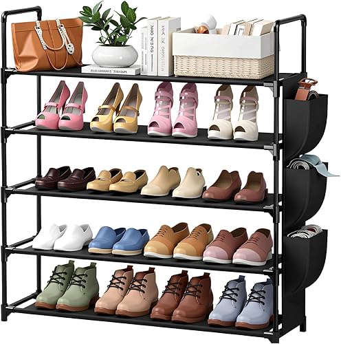 Dokeno Étagère à Chaussures 5 Niveaux, Étagère à Chaussures Amovible avec Poches Latérales pour 20 à 25 Paires de Chaussures, Meuble de Rangement Chaussure en Métal pour Entrée, Placard, Garage, Noir