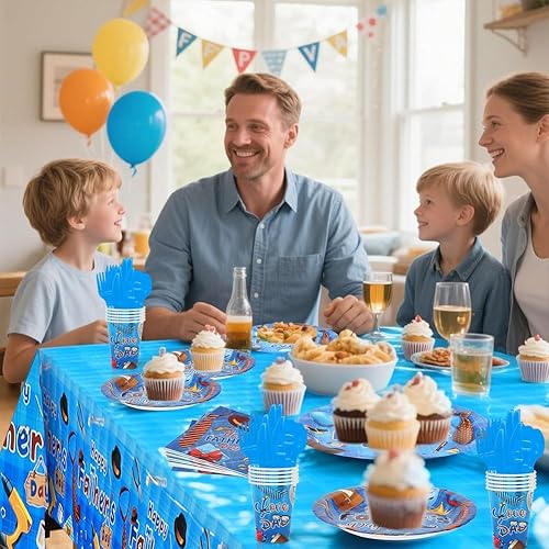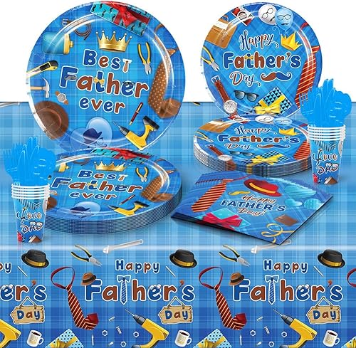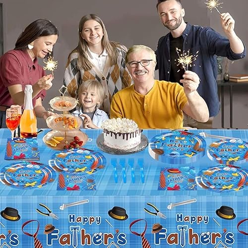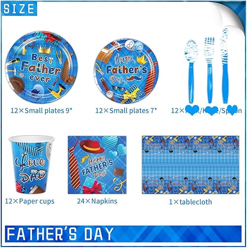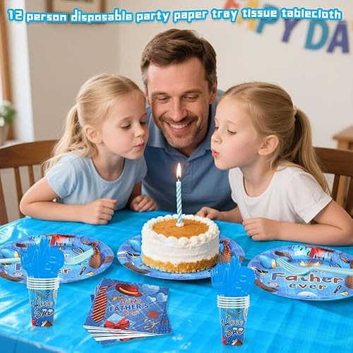 SYTTNUM 97 Pièces Set Vaisselle Fête Des Pères,Décoration Table Papa,Fournitures De Vaisselle, y Compris Assiettes, Tasses, Serviettes, Nappes, Kit Complet Décoration Père,12 Invités