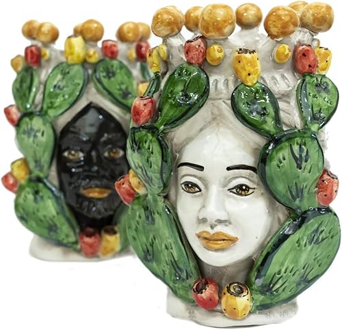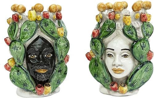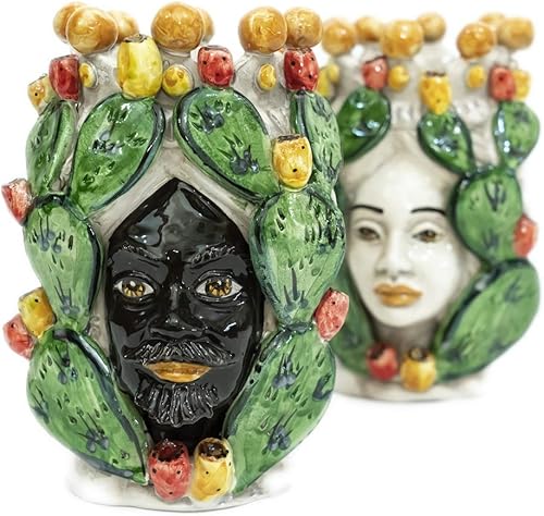 ILAB Paire de têtes de moro en céramique sicilienne de caltagirone réalisées et décorées à la main par les ceramistes de caltagirone, hauteur 20 cm, modèle ficodia, bibelots en céramique