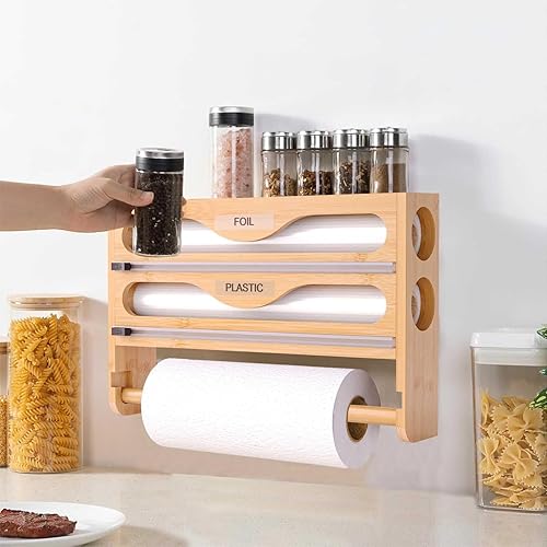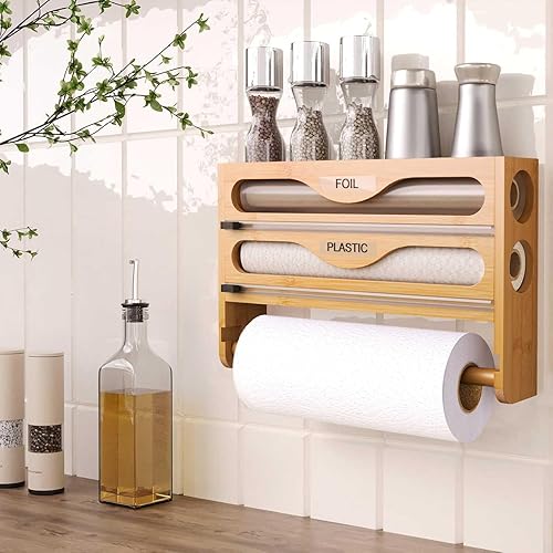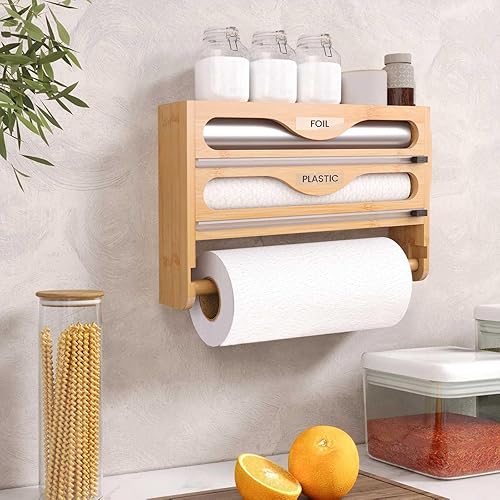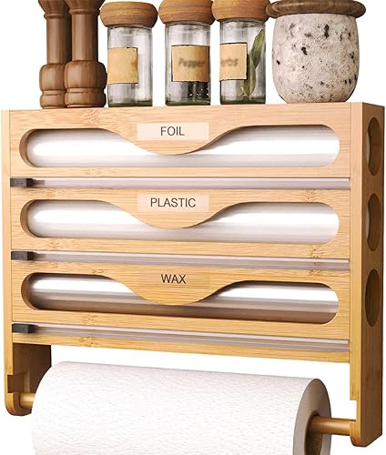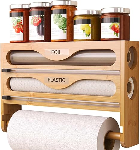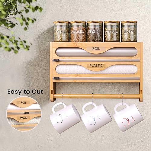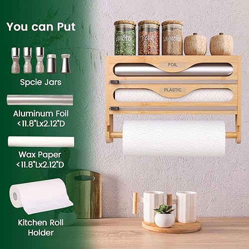 NBUABX Dérouleur Film Alimentaire avec Support Essuie Tout en Bambou, Distributeur Papier Aluminium et Film, Distributeur Film Alimentaire avec Coupeur, Compatible avec Rouleaux de 12'