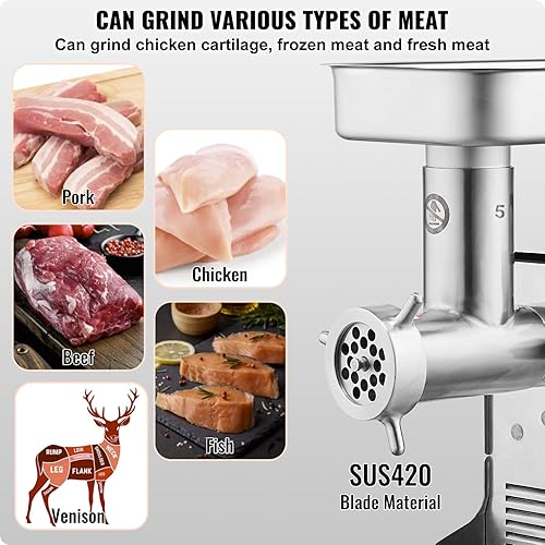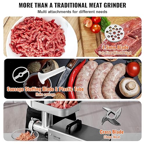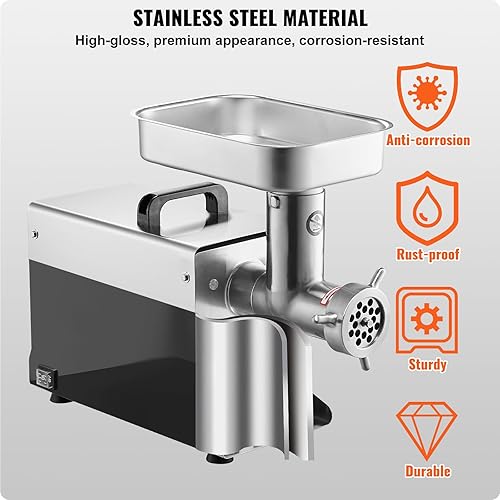 VEVOR Hachoir à Viande Électrique Commercial Capacité 2,3 kg/min, Hachoir Électrique de Comptoir, Poussoir à Saucisses avec Lame et Plaque de Broyage, en Acier Inoxydable, pour Cuisine et Restaurant
