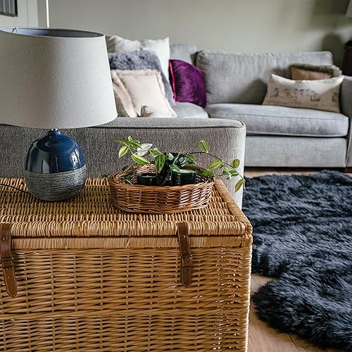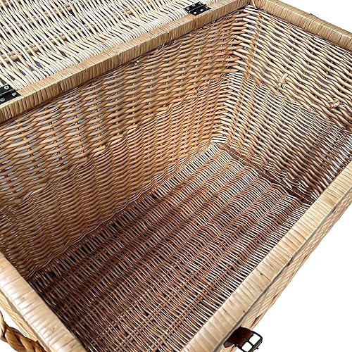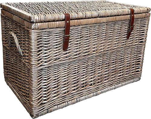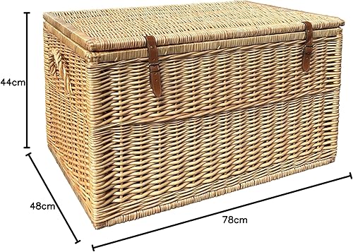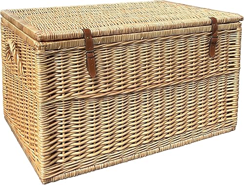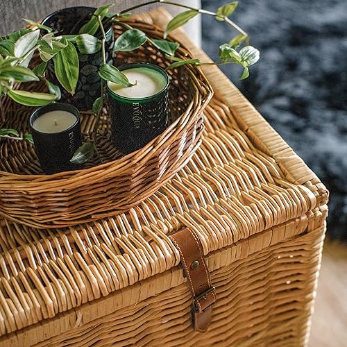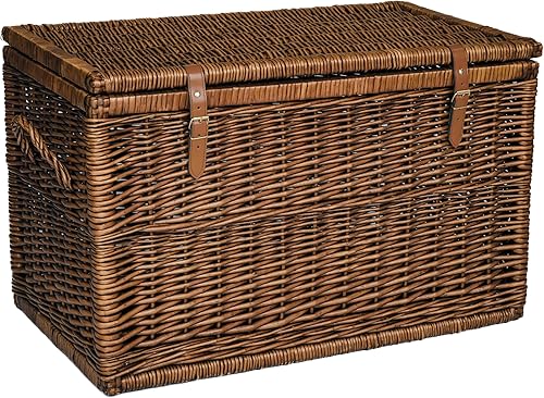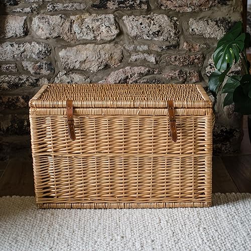 Arthur Cameron Modena Panier de rangement en osier de luxe avec couvercle, sangles en cuir pour sécuriser la fermeture et cadre en bois solide – Grand panier en osier, coffre de rangement, coffre de