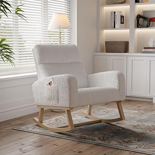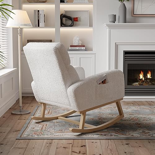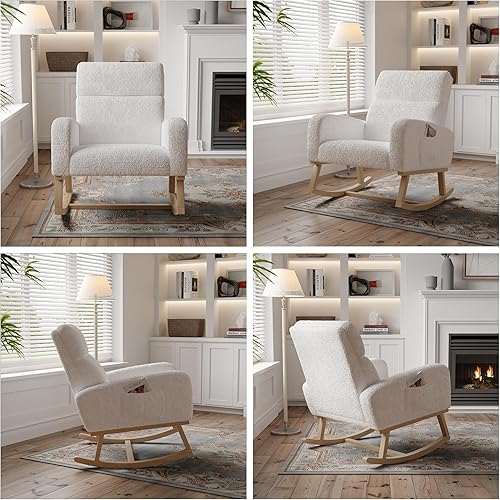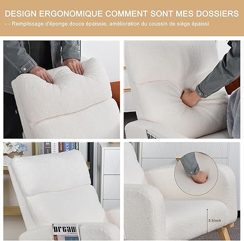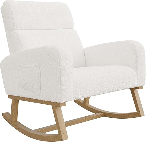 BRILVERDE Fauteuil à Bascule, Chaise a Bascule Allaitement, en Peau d'agneau Blanche, avec Autocollants antidérapants, pour Salon, Chambre à Coucher, Bureau, Blanc (Laine d'agneau)