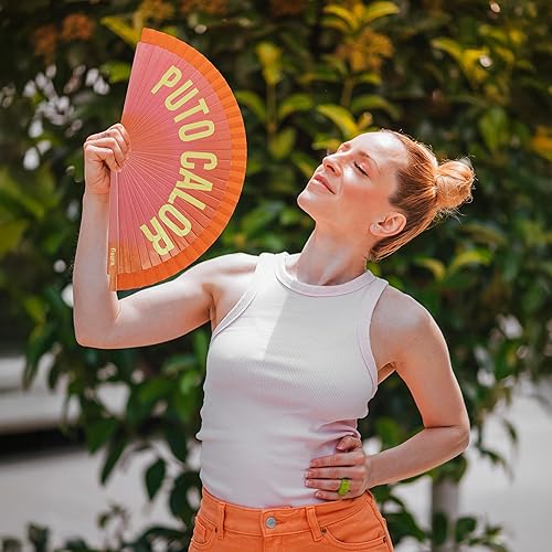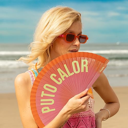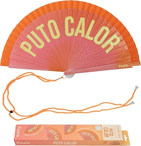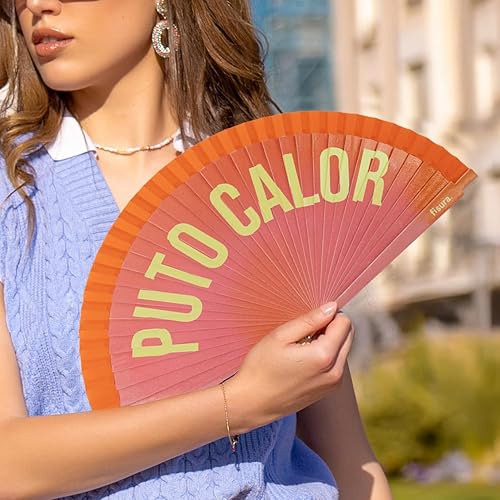 Fisura – Éventail original avec message « P*to calor ». Accessoire portable réversible en bois moderne. Ventilateur main dégradé rose orange vibrant. Crochet inclus. 42,5 x 23 cm