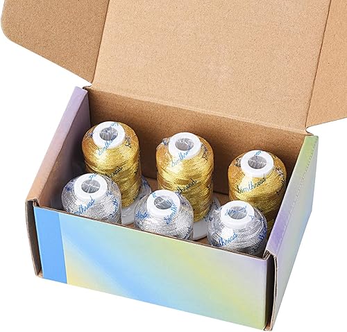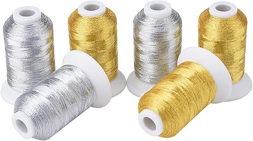 Simthread Lot de 6 bobines de fil métallique pour machine à broder (3 dorés + 3 couleurs argentées) 500 m (550Y) pour broderie et couture décorative