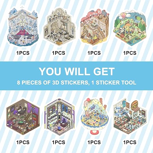 Lot de 8 autocollants 3D DIY pour scènes, stickers scrapbooking, stickers 3D pour adultes. Thèmes : magie, Égypte, glace et neige, trésors sous-marins et vie quotidienne