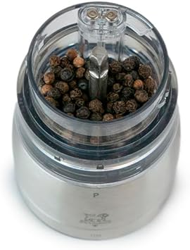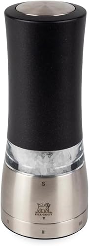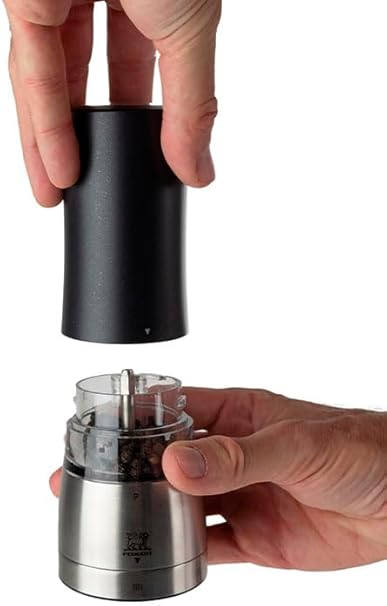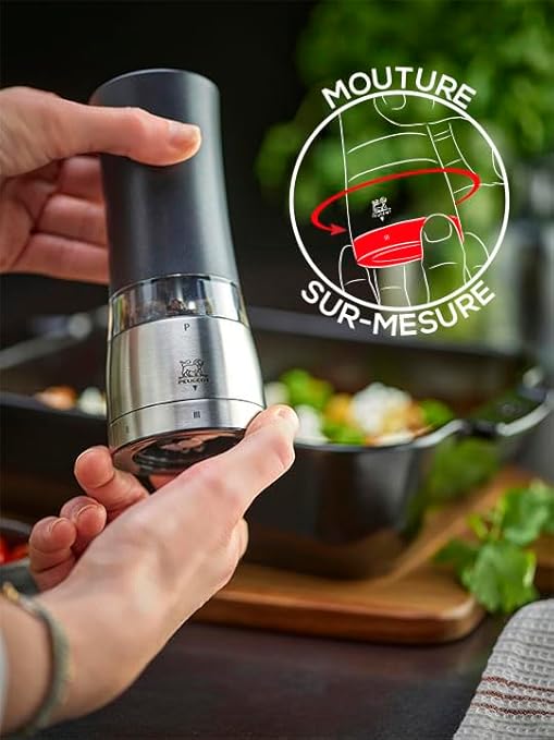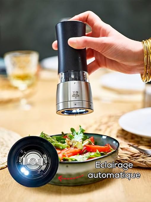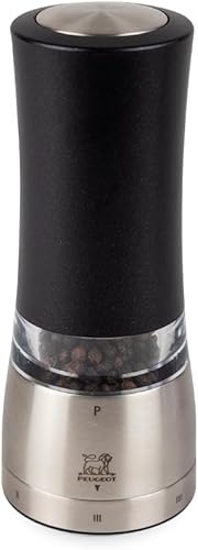 PEUGEOT - Moulin à Poivre Électrique Daman u'Select 16 cm - 6 Réglages De Moutures Prédéfinies - Grains De Poivre Inclus - En Aluminium - Designé En France - Coloris Noir Irisé