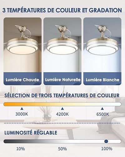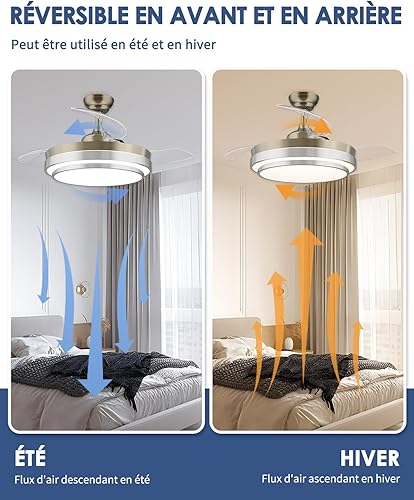 CJOY 107 cm Ventilateur de Plafond Pale Retractable avec Télécommande, Ventilateur Plafond avec Lumiere Dimmable, Silencieux DC Réversible, 6 Vitesses, Minuterie, Argent