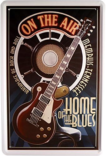 Num 850 Plaque en tôle rétro Motif de guitare avec message en anglais Home of the Blues 20 x 30 cm Plaque publicitaire