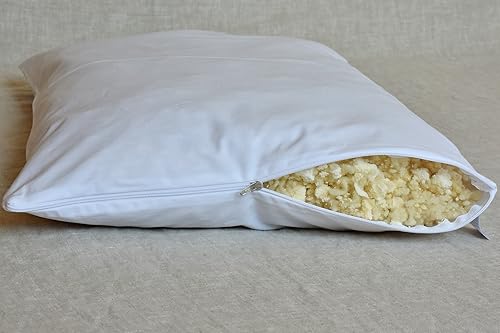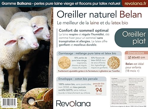 Revolana Oreiller Plat 100% Naturel Belan - Ganissage Perles de Laine/Flocons Latex - Enveloppe Coton Bio - 60x40cm