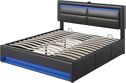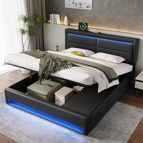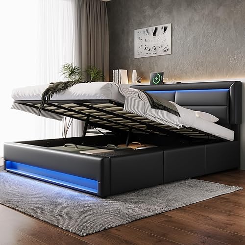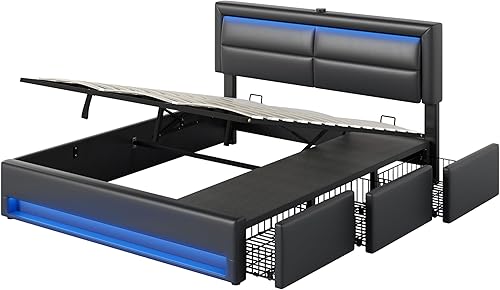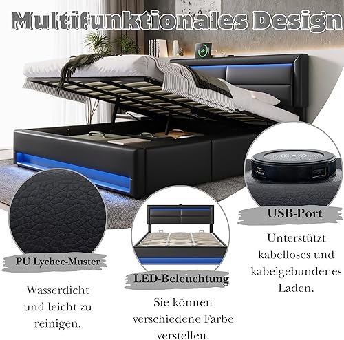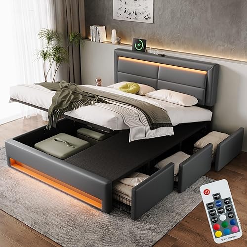 Lit 140 x 190 avec Sommier LED et USB, Lit Coffre 140x200 avec 3 tiroirs de rangement et tête de lit, Lit Double avec à Lattes, Lit 2 Personnes Lit Rembourré Cadre de lit 140 x 190 Gris(Sans Matelas)