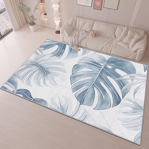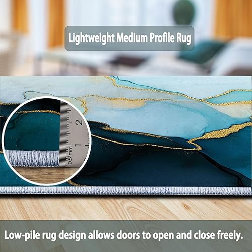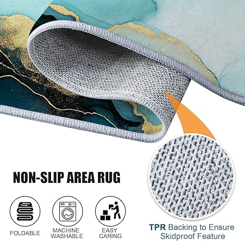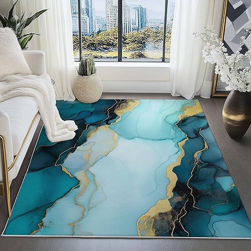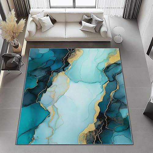 Tapis Salon Or Bleu Motif Marbre Ondulé Aquarelle Chambre de Décoration Tapis Poil Ras Lavable en Machine, Tapis Rectangulaire Antidérapant Salle a Manger Chambre Adulte 60 x 110 cm