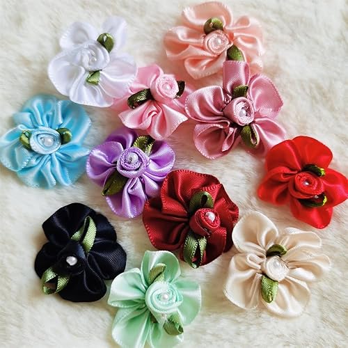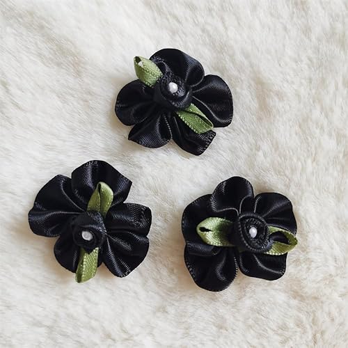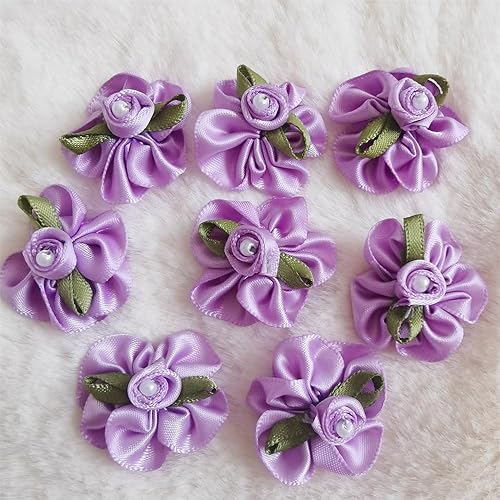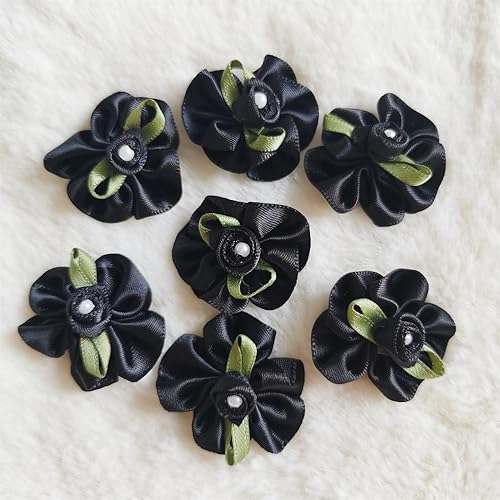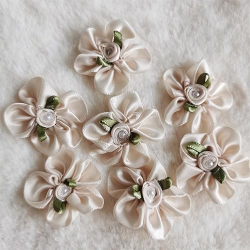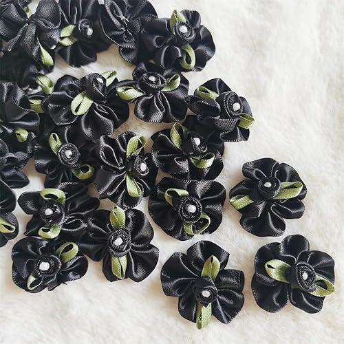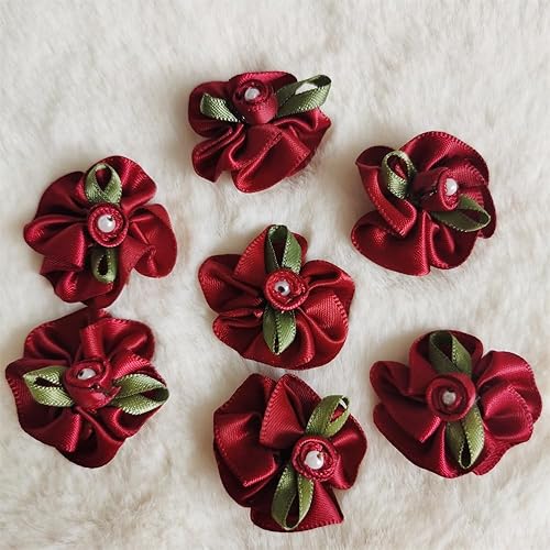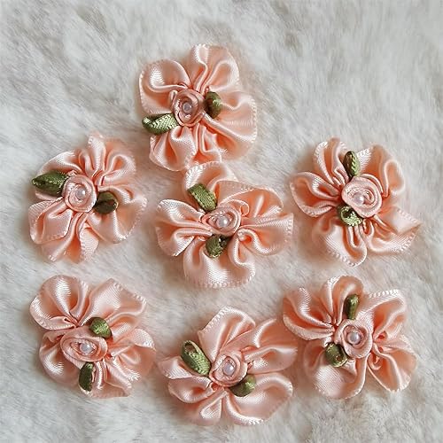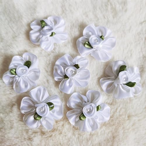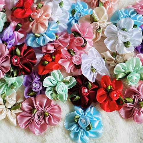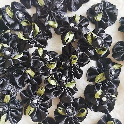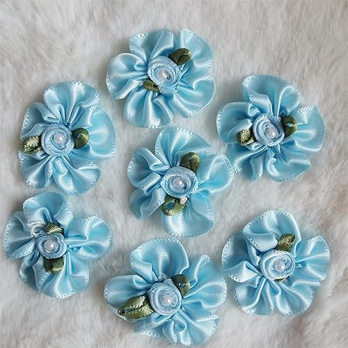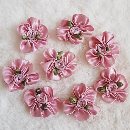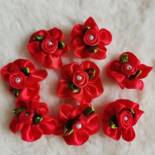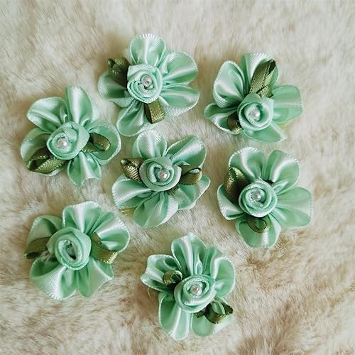 QIUDA Lot de 100 nœuds de fleurs en ruban satiné de 3 cm avec perles et roses - Pour décoration de mariage, couture, bricolage, boîte cadeau (vert menthe)