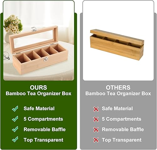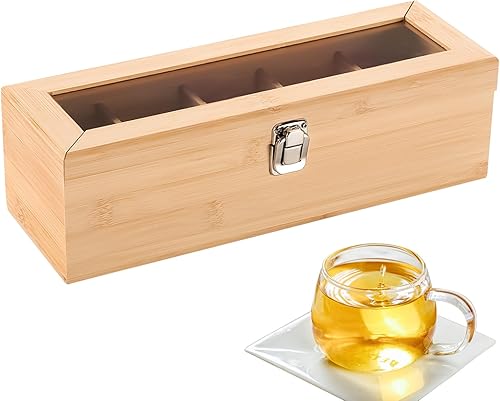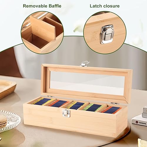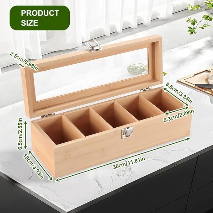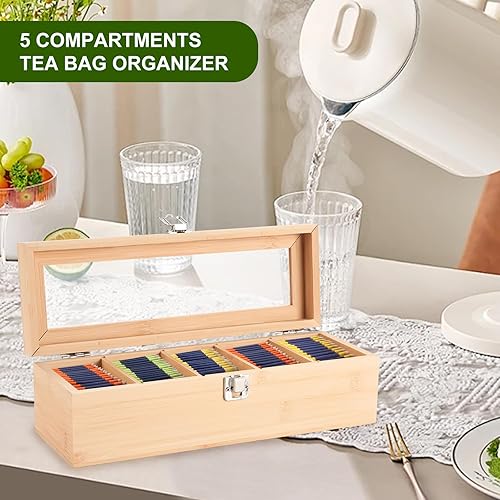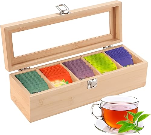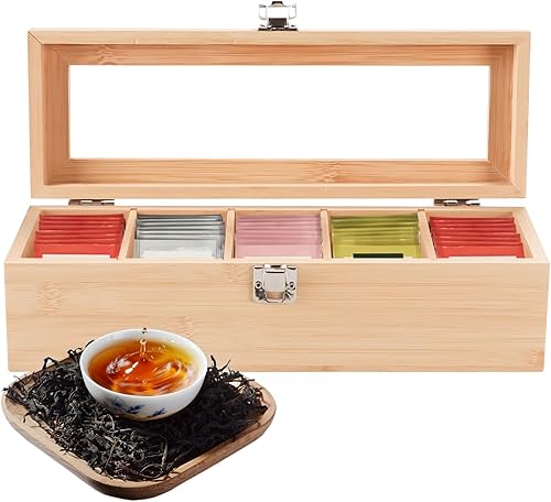 Boîte à Thé en Bambou 5 Compartiments, Boîte de Rangement Pratique pour Les Sachets de Thé, Coffret Sachets Thé avec Petite Fenêtre, Boîte Sachets de Thé 30 * 10 * 9cm