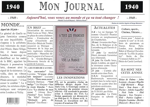 Générique Set de Table année 1940 - Mon Journal - plastifié - Année de Naissance ou Anniversaire - Idéal pour Cadeau