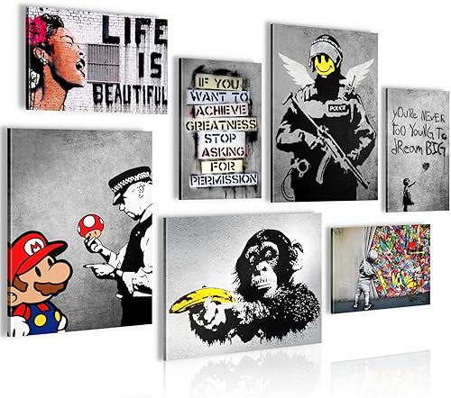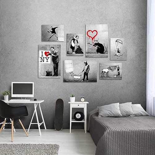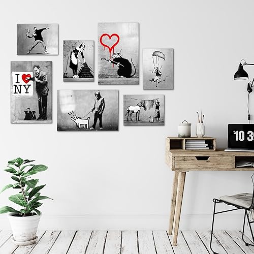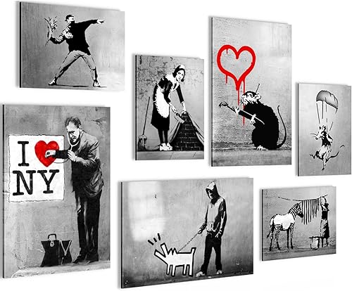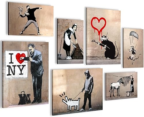 Novart- Tableau Décoration Murale- Banksy- I love NY- Decoration Chambre Salon- Prêt à être Accroché- 7 Cadres de 30x40 & 20x30 cm- Beige- N003271a