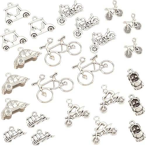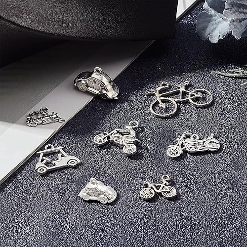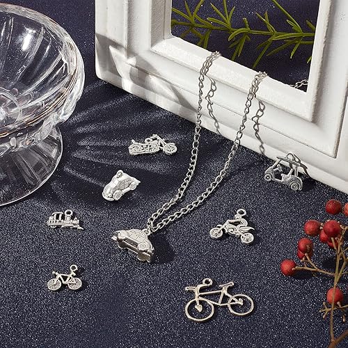 SUNNYCLUE 1 Boîte 48 Pcs 8 Styles Vélo Charmes Alliage Pendentifs Vélo Moto Voiture Tour Bus Train Charm Kit Argent Transport Pendentif pour Fabrication de Bijoux Charmes DIY Collier Bracelet