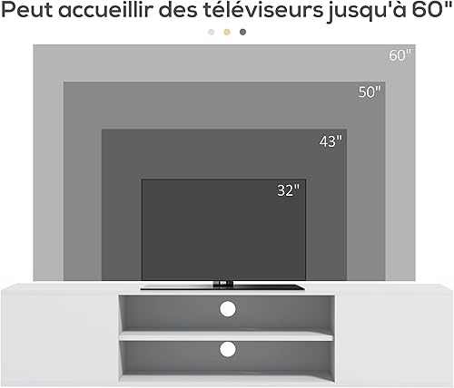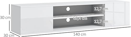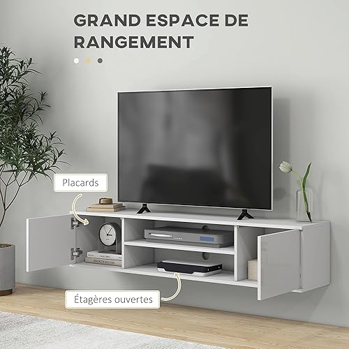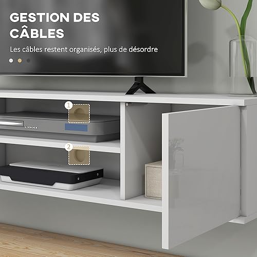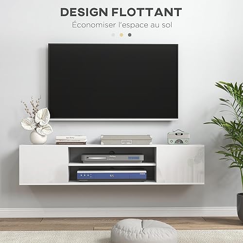 HOMCOM Meuble Banc TV Mural Suspendu Style Contemporain - 2 placards 2 Passe-câbles et 2 niches centrales 140 x 30 x 30 cm Blanc