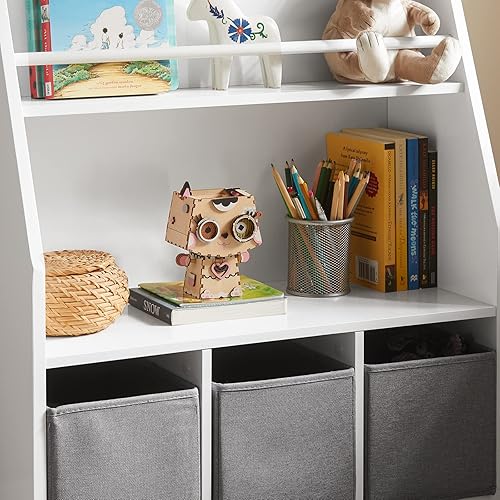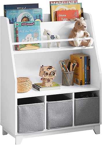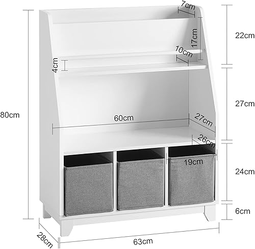 SoBuy Bibliothèque Étagère à Livres Étagère de Rangement Jouets pour Enfants Porte-revues avec Compartiments de Rangement et 3 Paniers 63x28x80 cm, KMB34-W