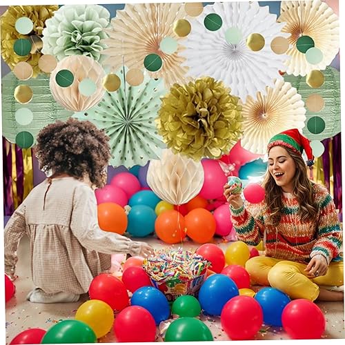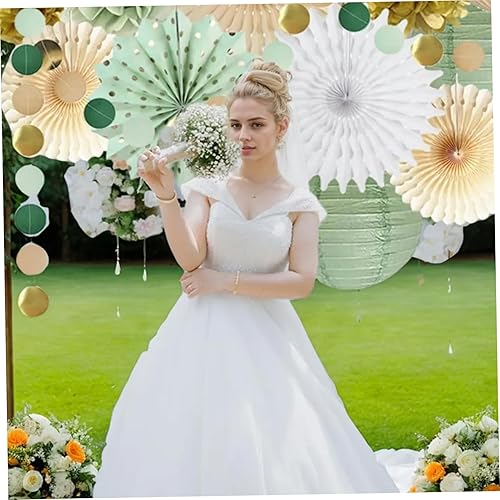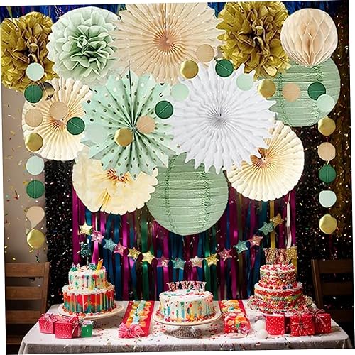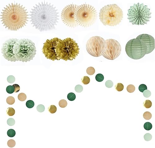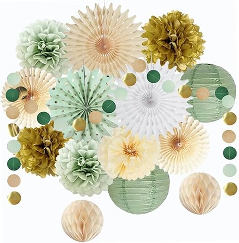 15 pièces décorations de fête vert sauge lanternes en papier pompons en papier et éventails en papier décorations de fête avec points de paillettes suspendus pour mariage douche nuptiale décoration de