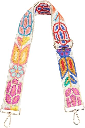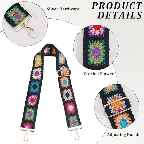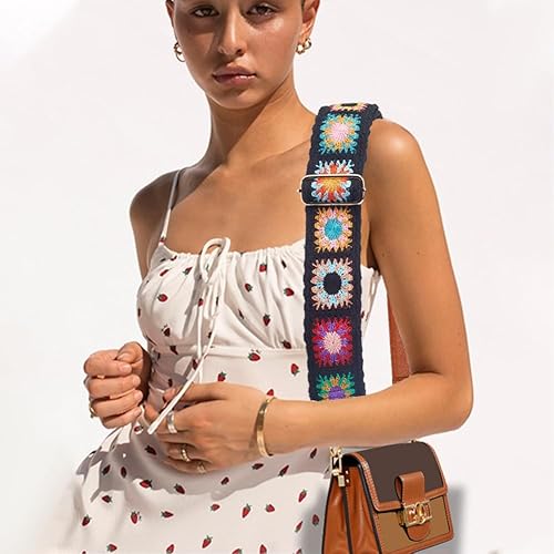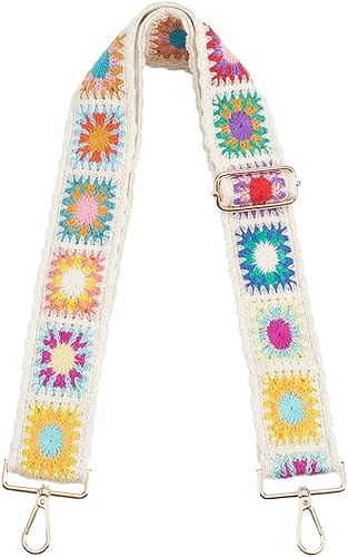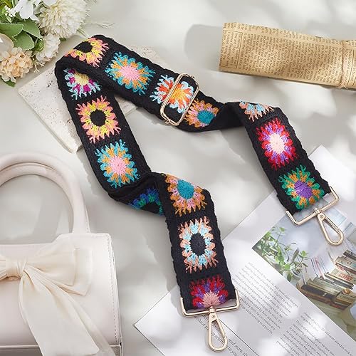 CREATCABIN Sangle Sac Main Crochet avec Motif Floral Coloré Sangle Rechange Style Ethnique Broderie Florale Tricot Large Réglable avec Boucles Métal Doré pour Guitare Sac Bandoulière Fourre Tout