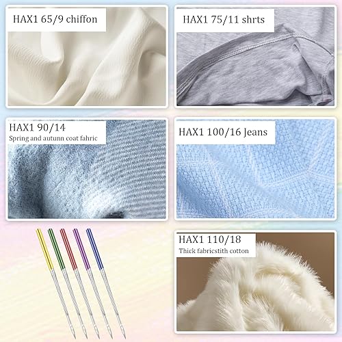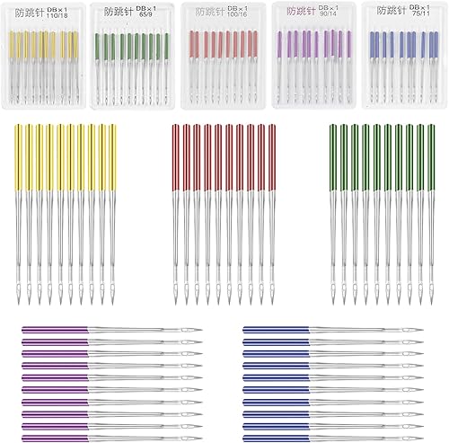 Tucnoeu Lot de 50 aiguilles universelles pour machine à coudre - Pour machine à coudre - Pour machine à coudre - Pour jeans, cuir, tissus - 5 tailles et 5 couleurs