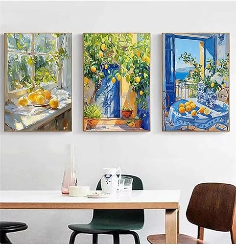 LZJAGXX Affiche de paysage côtier avec citronnier méditerranéen, fruits, nature morte, peinture sur toile, art mural, décoration de cuisine, maison, 60 x 80 cm, sans cadre