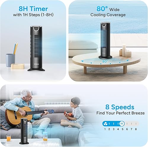 DR.PREPARE Ventilateur Tour, Ventilateurs de Table avec Télécommande, Ventilateur Silencieux 25 dB, 7m/s, 8 Vitesses, Minuterie 1-8H, Ventilateur Oscillant pour Chambre à Coucher, Bureau, Camping-Car
