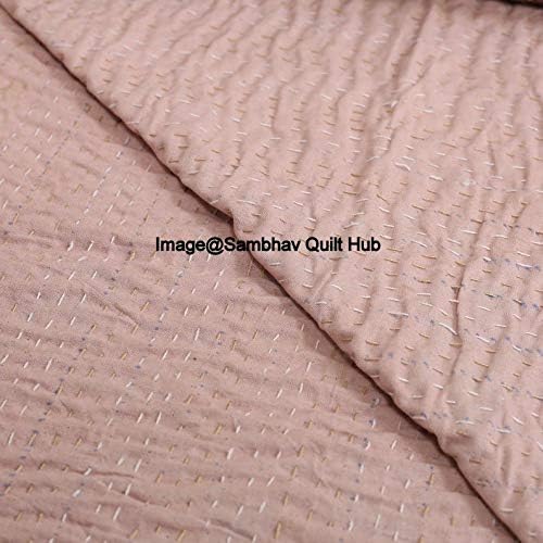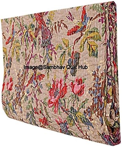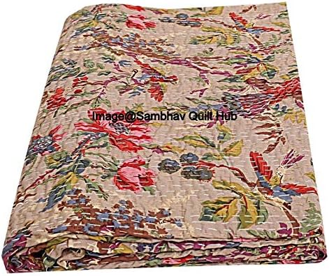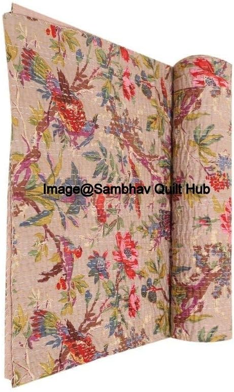 Couvre-lit beige fait à la main avec oiseaux de style bohème pour grand lit/lit simple/très grand lit – Couvre-lit fait à la main avec imprimé d'oiseaux Kantha – Couverture unique (228,6 x 274,3 cm)