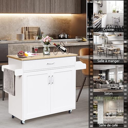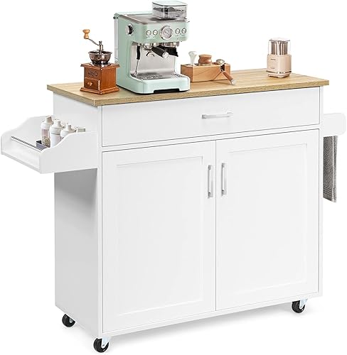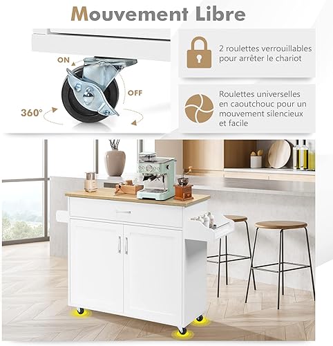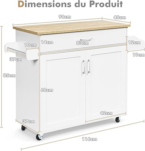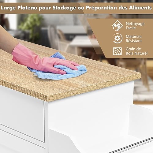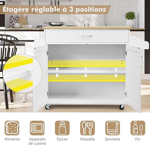 GIANTEX Desserte à roulettes Cuisine 85 CM, Chariot de Cuisine en Bois avec Placard Étagère sur 3 Niveaux et Support à Épice, îlot Central Cuisine avec Grand Tiroir et Planche