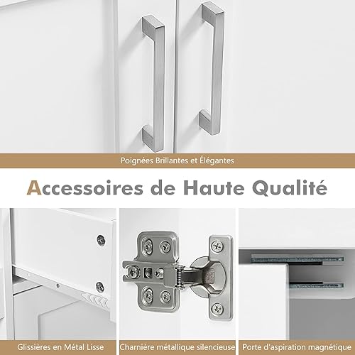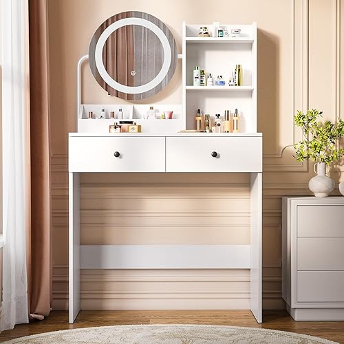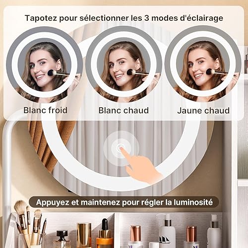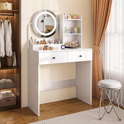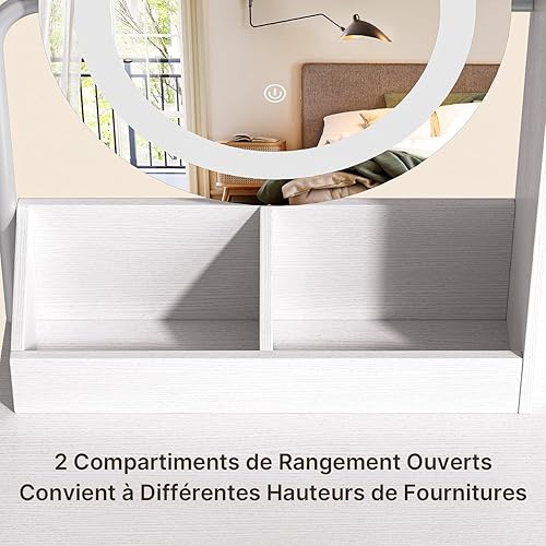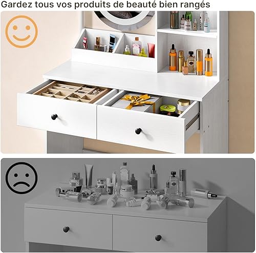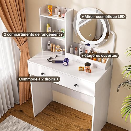 Xbro Coiffeuse avec éclairage LED, luminosité réglable, Miroir et 2 tiroirs, 2 étagères et Compartiments Ouverts, Moderne, 77 x 39 x 134 cm, Blanche