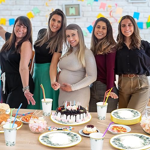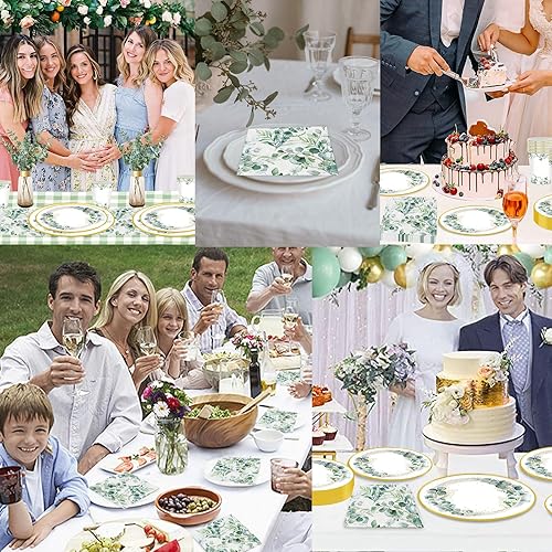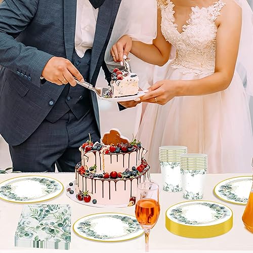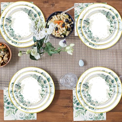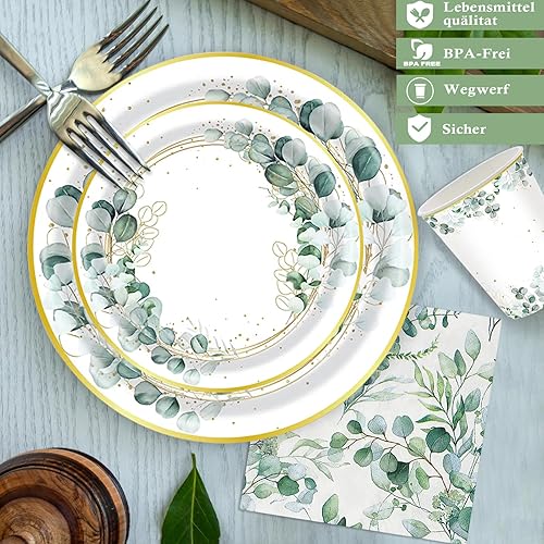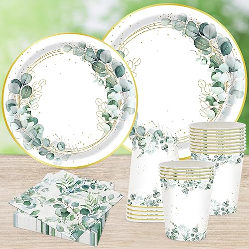 Wentsent Lot de 96 assiettes en carton vert eucalyptus avec assiettes en carton gobelets serviettes pour fête prénatale, anniversaire, mariage, fête prénatale, garçon et fille, décoration de table