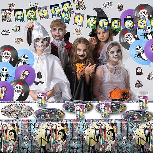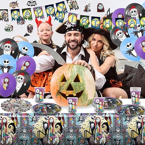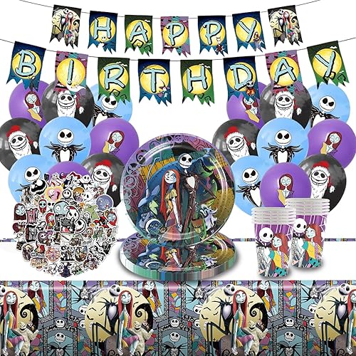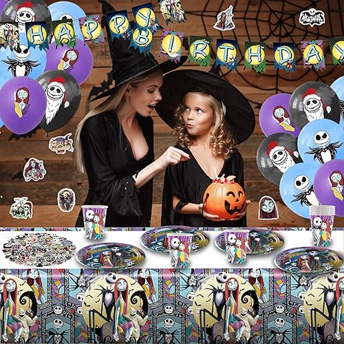 DEVOKE 84 Pièces Nightmare Before pour Fête de Noël et Halloween Cauchemar Veille, comprenant Assiettes, Tasses, Nappes, Bannières, Ballons, Autocollants, Décorations pour Halloween.