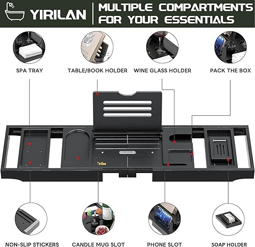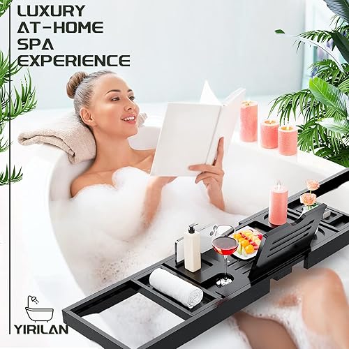 Yirilan Plateau de baignoire pliable - Planche de bain réglable en bambou - Avec étagère à livres - Convient à la plupart des baignoires - Noir