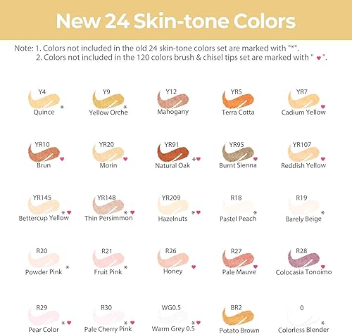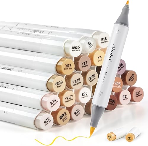 Ohuhu Honolulu B Lot de 24 feutres à alcool de couleur chair, pinceaux et fins, marqueurs d'art à base d'alcool pour adultes, illustration, couleurs moyennes et couleurs de cheveux