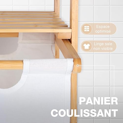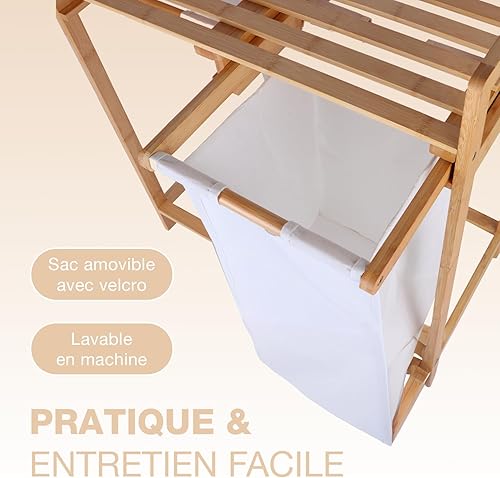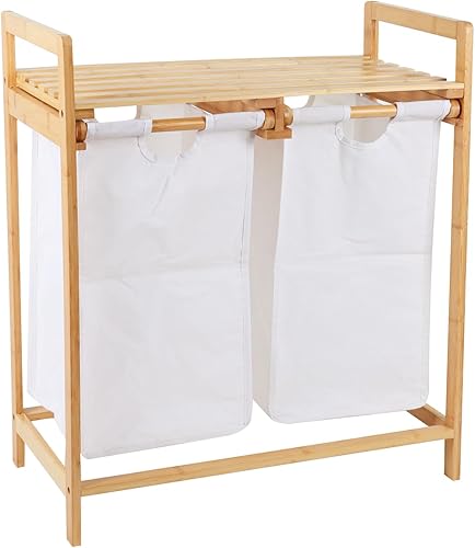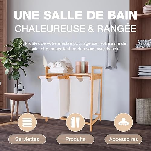 CATAVANA - Panier à Linge en Bambou - Rangement 2 Compartiments en Tissu (30L chacun) - Idéal Salle de Bain et Buanderie - Dimensions : 64x33x73 cm - Couleur : Blanc