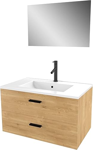 AURLANE Meuble Salle de Bain 80 cm Monte Suspendu Decor Bois H46xL80xP45cm - avec tiroirs - Vasque et Miroir