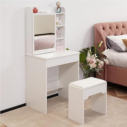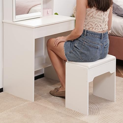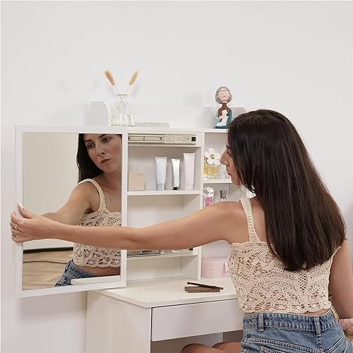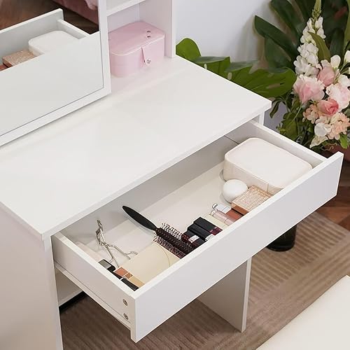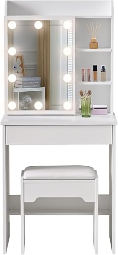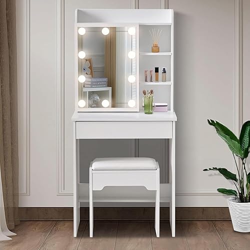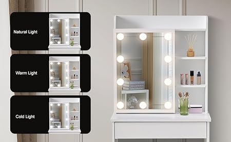 LEMROE Coiffeuse Hollywood avec Miroir LED et Tabouret, Table de Maquillage,Bureau Coiffeuse Blanche avec 7 étagères et 1 Grand Tiroir pour Chambre à Coucher