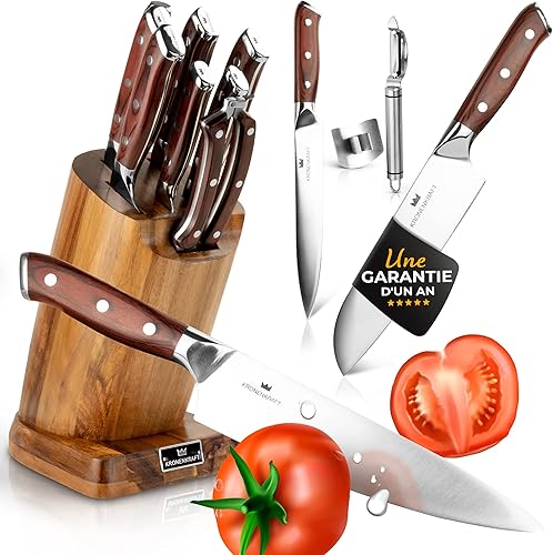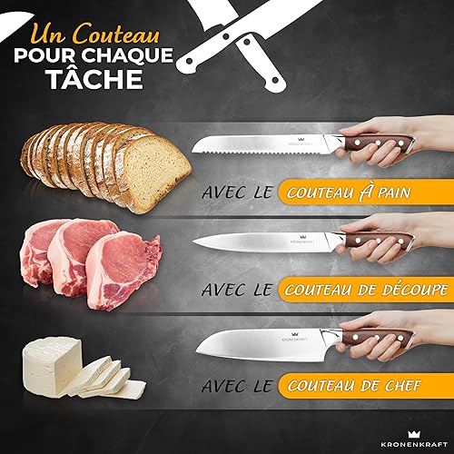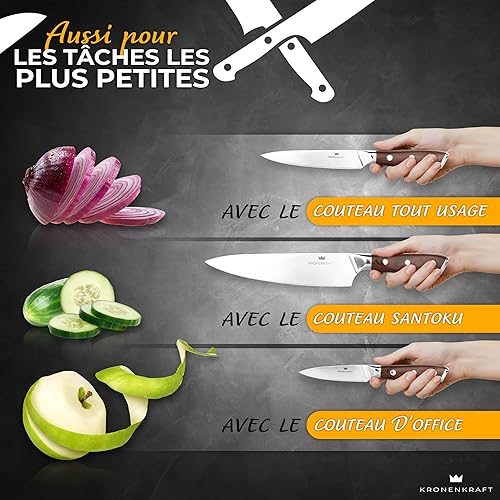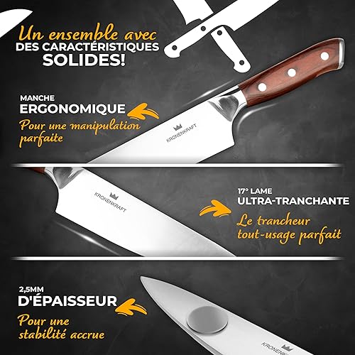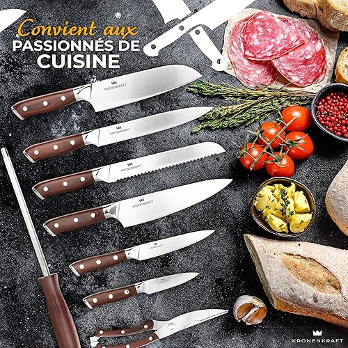 Set de Couteaux KRONENKRAFT® de 9 Pièces - Inclut Couteau de Chef, Couteau Santoku, et Plus - Fabriqué en Acier Allemand, Manche en Bois Pakka - Idéal pour Cuisine Professionnelle