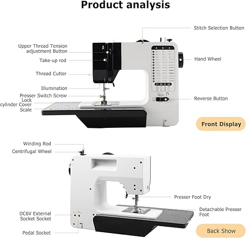 Machine à coudre avec table d'extension, machine à coudre pour débutant avec 38 programmes de couture, petite mini machine à coudre à 2 vitesses