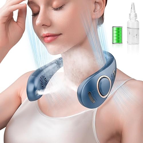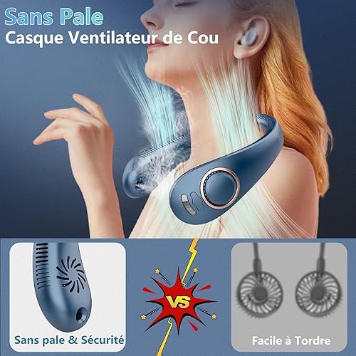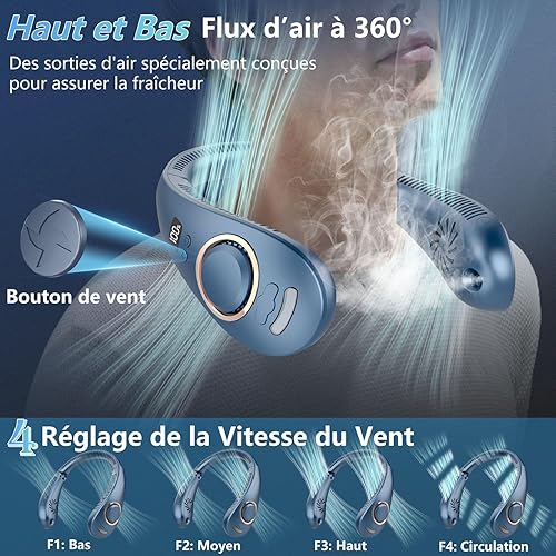 Ventilateur Portable Cou,Brumisateur Ventilateur de Tete Vaporisateur avec Flux d’air à 360°,4 Niveaux Personnel Casque Ventilateur a Pile Sans Lame et Mains Libres,Cadeau Pour Femmes et Hommes Bleu