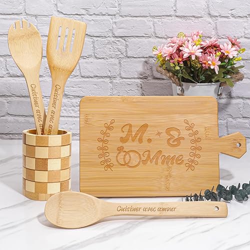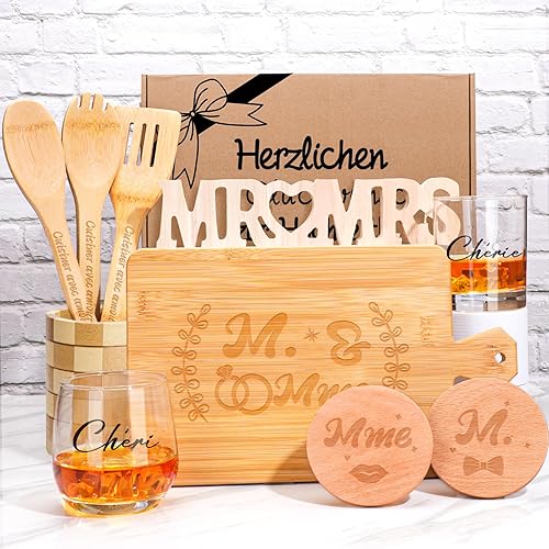 Tapis et Ensembles Coffret Cadeau de Mariage 10 Pièces, Bambou avec Planche, Verres, Dessous de Verre, Ustensiles de Cuisine, Support et Décoration MR & MRS,Cadeau Couple Marié