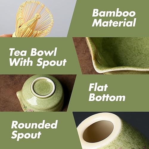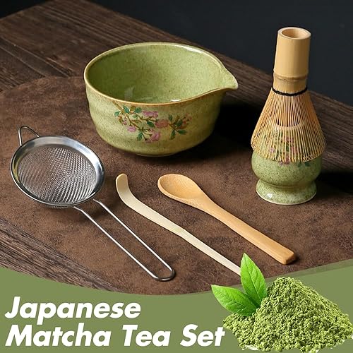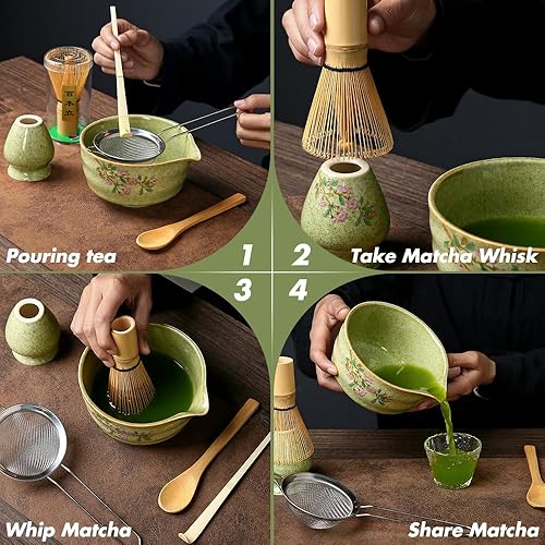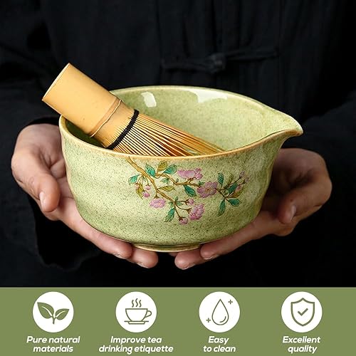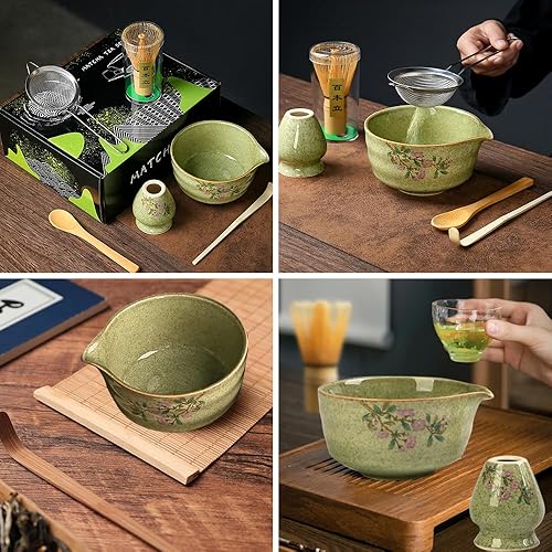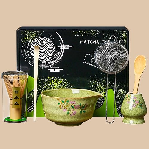 Rppiup Ensemble de 6 fouets à matcha avec fouet et bol, support, cuillère, tamis, kit à matcha imprimé fleurs de cerisier, élégant service à thé japonais pour faire des usucha, koicha et latte (rose