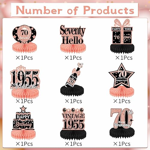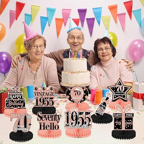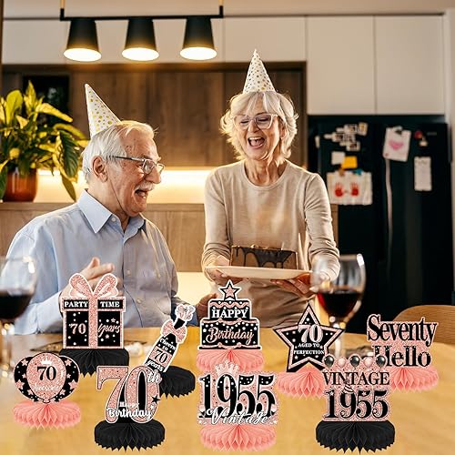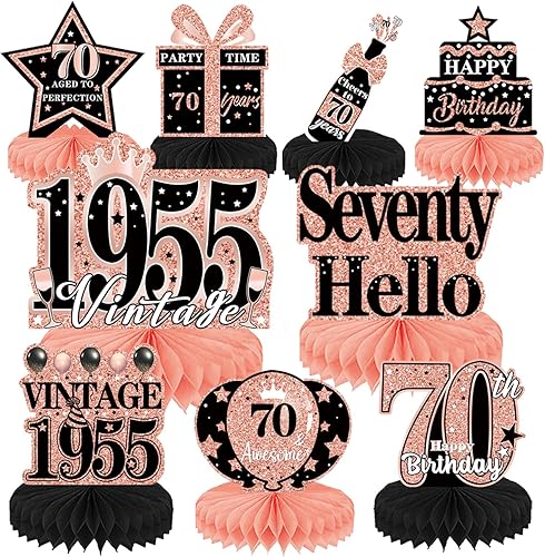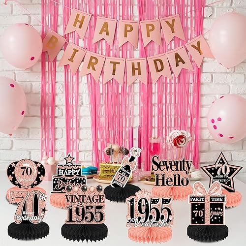 Luvart Décorations de table pour 70e anniversaire pour femme – Décorations de table en or rose pour 70e anniversaire – Décorations vintage en nid d'abeille pour centre de table de 1955 – Fournitures